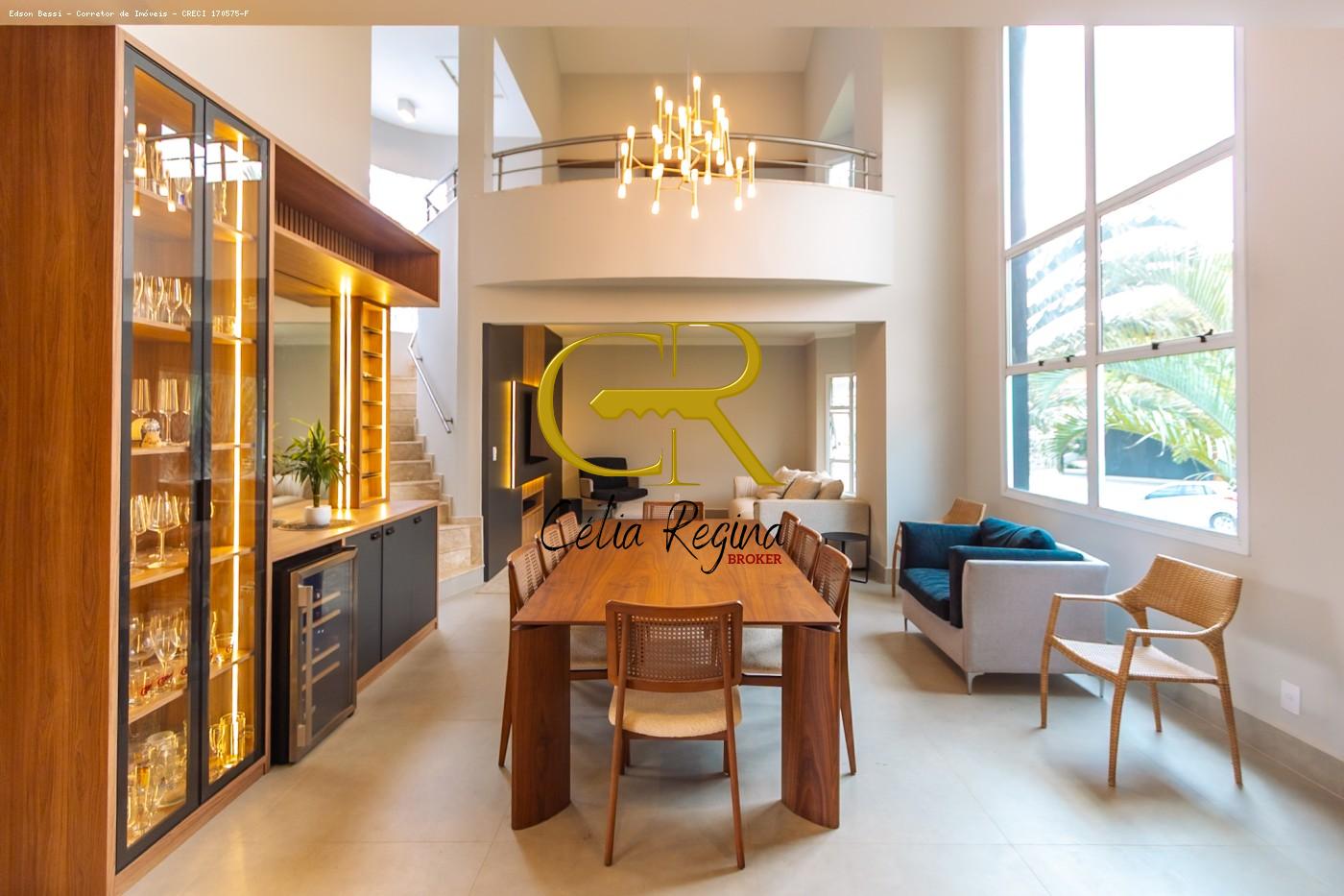 - Sala de jantar com pé direito duplo, uma janela imensa, que trás iluminação e conforto térmico, e uma cristaleira com adega fantástica.